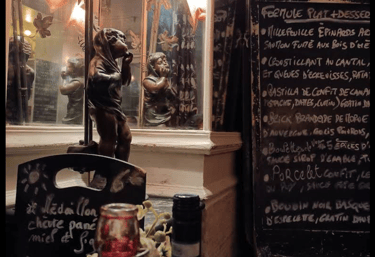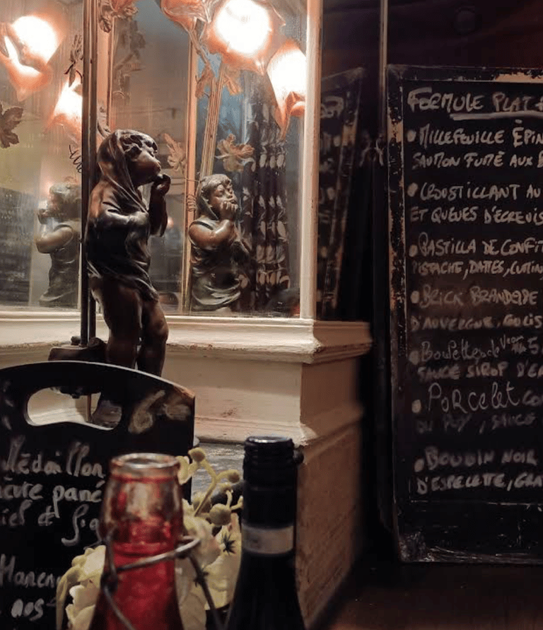 Ambiance intimiste avec luminaires art nouveau et ardoises murales remplies de suggestions.